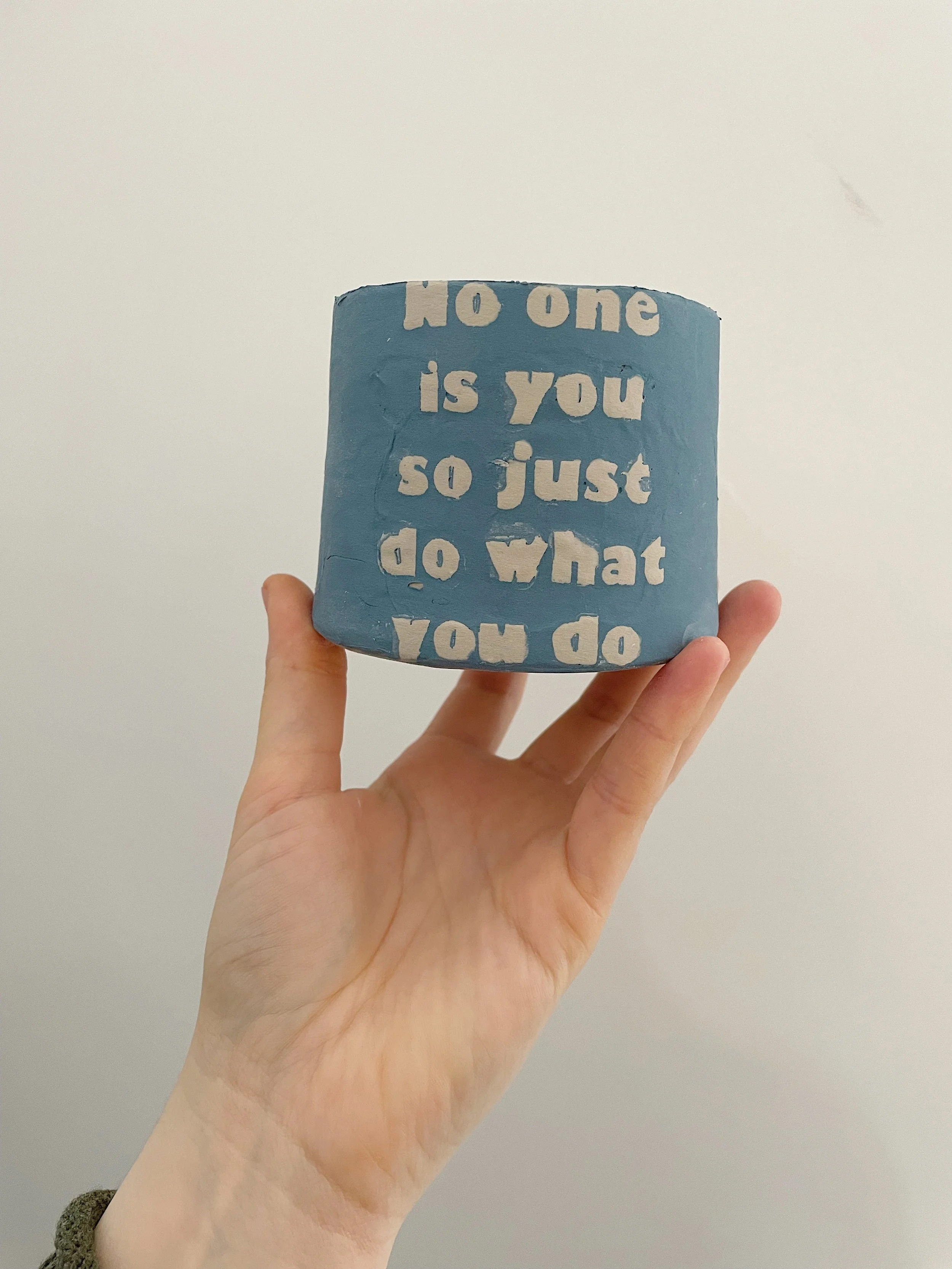 So i’ve been a little bit obsessed with word mugs. I have officially worked through my second batch of experiments. So I know what is definitely not working, and what needs to be improved on. I am currently onto round three of attempts. I found this wonderful printmaking technique from Catie Miller, a ceramicists in Fargo, ND. Definitely check out her instagram page @catiemillerceramics. She also paints stunning murals! Anyway, she has kind of perfected this printmaking technique on clay, and I decided to try it out on my word mugs. After a couple of weekends of attempting and repeatedly failing her technique. I have made minor tweaks, and I think I finally got it down. My mugs are keeping their form, and I truly can’t wait to see them fired. I added a few pics below, depending on how they fire I think I might try doing an online sale. I’m trying to change the way I run different aspects of my life, and doing an online sale actually feels like a good idea right now.